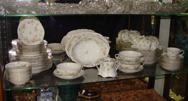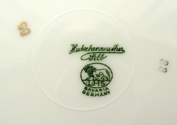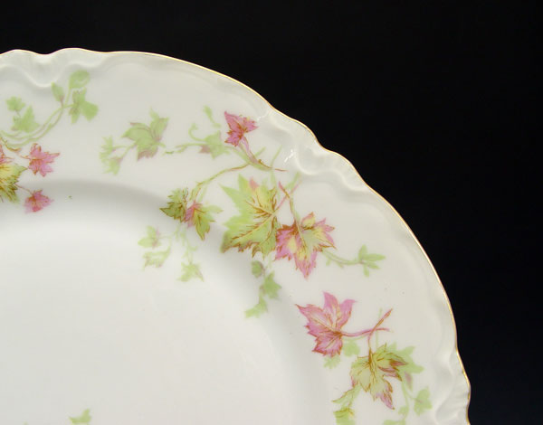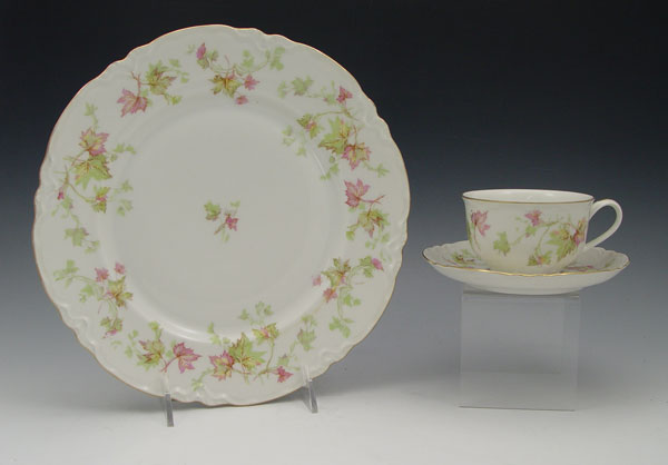 HUTSCHENREUTHER ''AUTUMN LEAVES'' PARTIAL CHINA SERVICE: 64 pieces to include 11 dinner plates, 11 salad plates, 9 bread plates, 10 dessert bowls, 3 cream soups with saucers, 9 cups, with saucers, a platter, and serving bowl.