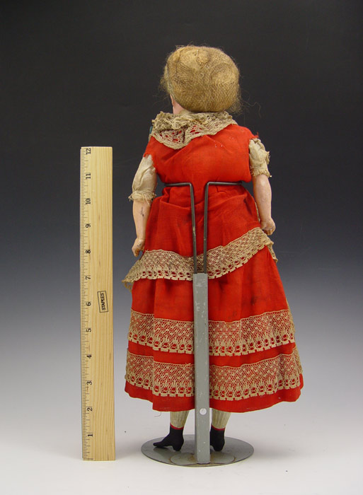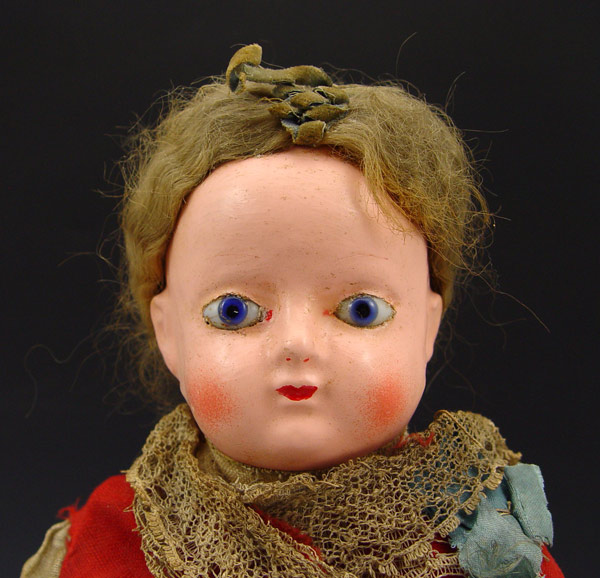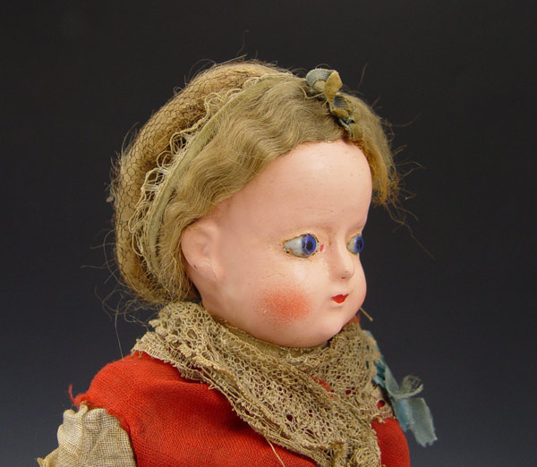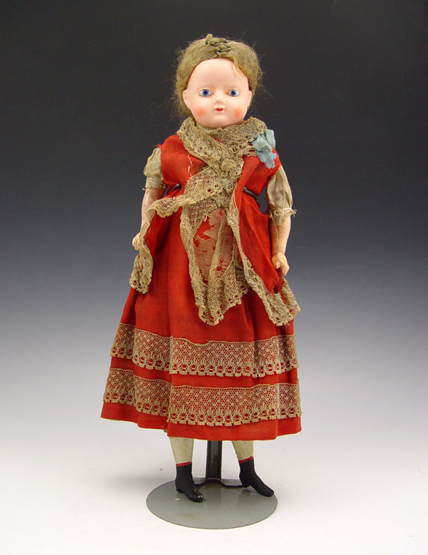 ANTIQUE WAX DOLL: 15 1/2'' tall, wax head with inset glass eyes. Straw stuffed cloth body, Clothes are original.