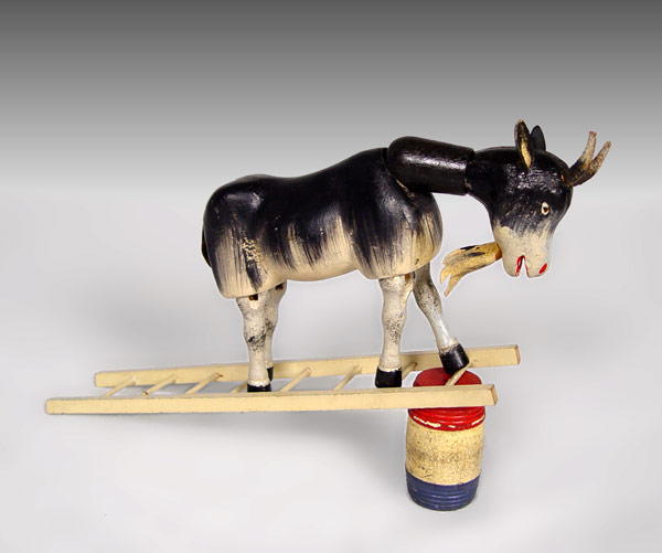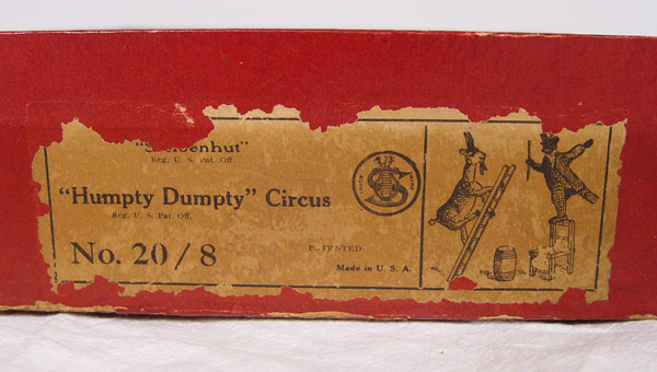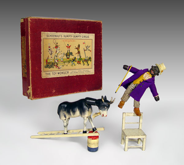 SCHOENHUT HUMPTY DUMPTY CIRCUS 20 / 8 IN ORIGINAL BOX: Set includes 1) ''Black Dude'' with original costume, 9'' h. 2) Goat, 5'' h. x 8 1/2''. 3) Ladder, 11 3/4'' h. 4) Chair, 5''. 5) Barrel 2 3/4''. Sold with original box marked 20 / 8''. Box measures 3 1/4'' h. x 14 1/4'' x 12 1/4''.