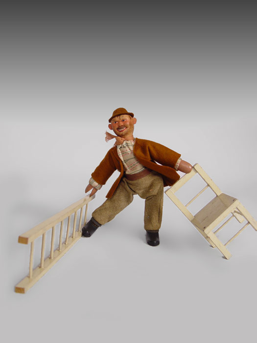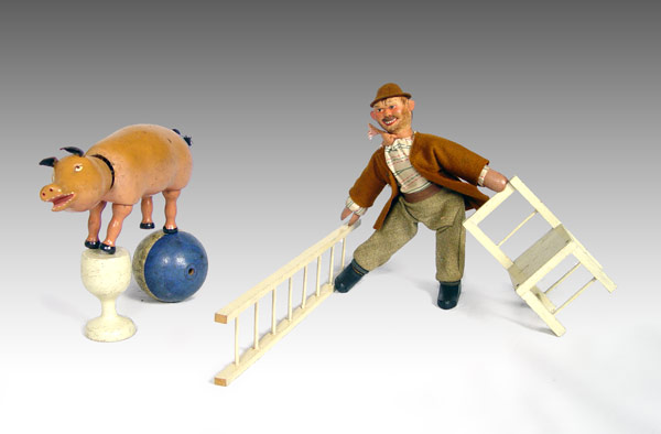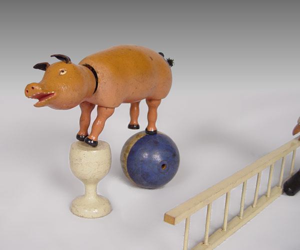 SCHOENHUT HUMPTY DUMPTY CIRCUS 20 / 9 IN ORIGINAL BOX: Set includes 1) ''Hobo'' with original costume 8'' h. 2) Pig, 3 1/2'' h. x 7 1/4''. 3) Ball 2 3/4'' h. 4) Stand for ball 2 3/4'' h. 5) Chair, 4 1/2''. 6) Ladder, 11 1/4''. Sold with original box marked 20 / 9, measures 3 1/4'' x 14 1/4'' x 11 1/4''.