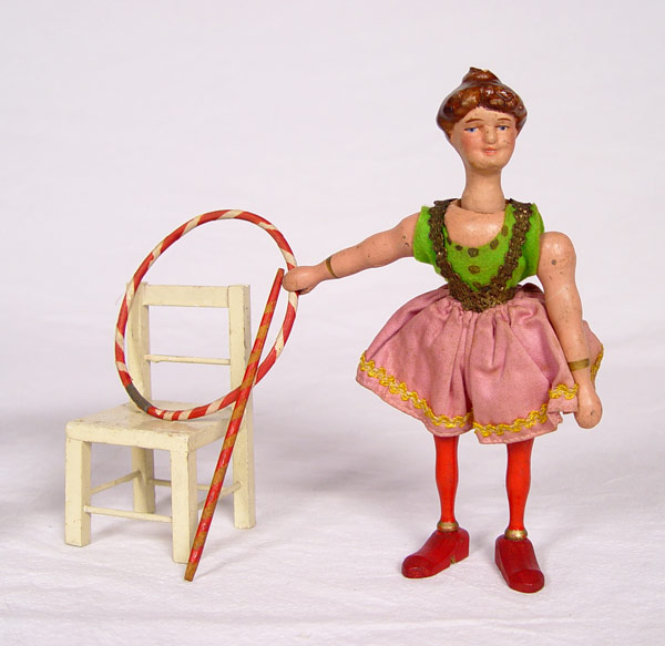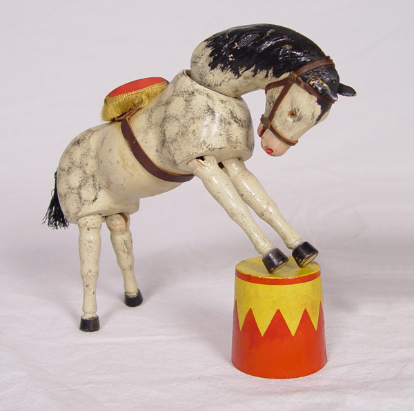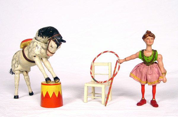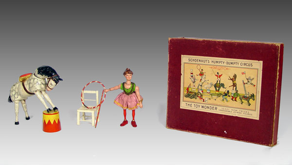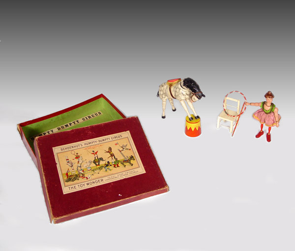 SCHOENHUT HUMPTY DUMPTY CIRCUS 20 / 12 IN ORIGINAL BOX: Set includes 1) Blond circus rider in original costume (8 1/2''). 2) Horse with standing platform on back, 7 1/2'' h. x 10'' l. 3) Barrel 2 1/2'' h. 4) Chair 4 1/2'' h. 5) 3 3/12''. Sold with original box Marked No. 20 /12, measures 3'' x 14 1/4'' x 12 1/4''