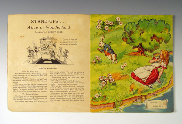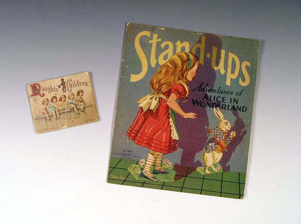 NAUGHTY CHILDREN BOOK and ALICE POP UP BOOK: To include 1) OVERTON, Robert, ''Naughty Children'', Published by W. Hagelburg, London & New York. Note front cover bend, partial loss back cover , toning to corners. 2) SAGE, Sidney, ''Stand-Ups Adventures of Alice in Wonderland'', complete with all pop ups present. Note corner bends, nicks on covers.