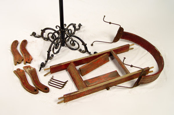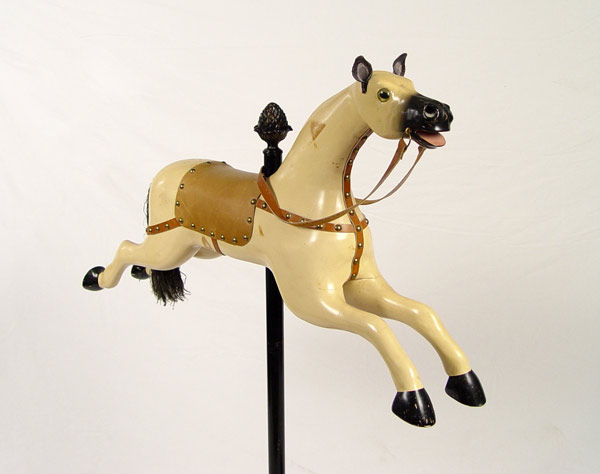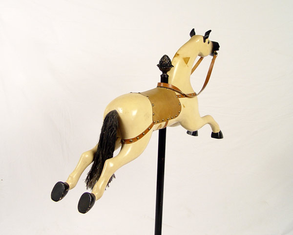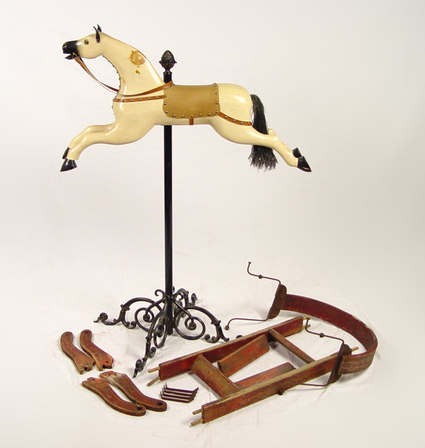 EARLY CARVED & PAINTED HOBBY HORSE: In restored condition, on an iron stand. Accompanied by the original frame and rocker. Horse is 20'' x 35'' long. On the stand, 50'' tall overall.