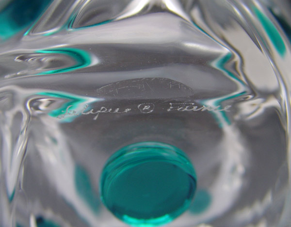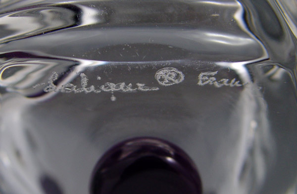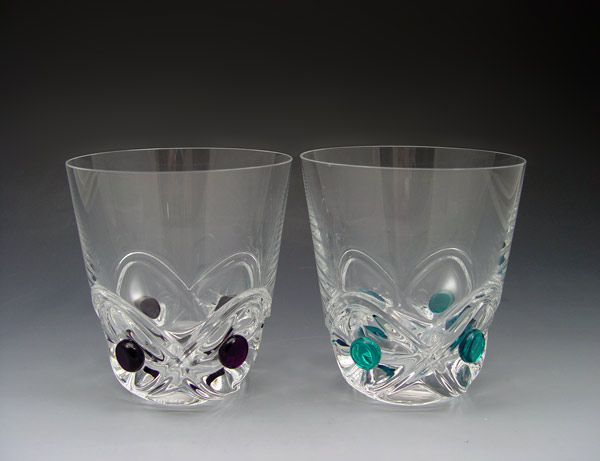 2 LALIQUE ''FLORIDE'' CRYSTAL TUMBLERS: Each with applied colored buttons, teal and purple, approx. 4 1/2'' tall. Please note tiny fleck on one.