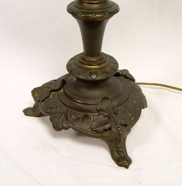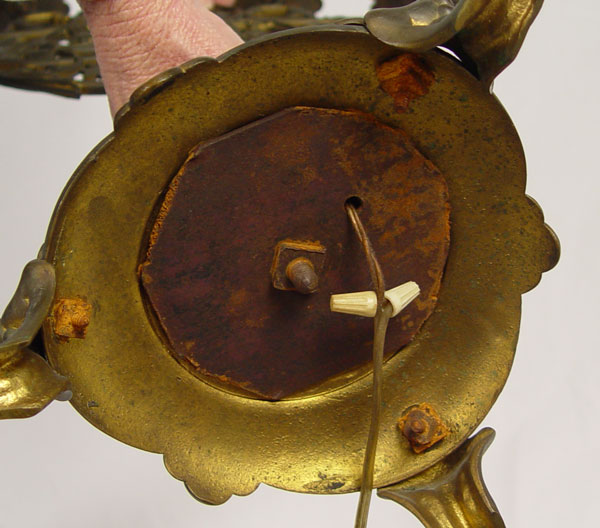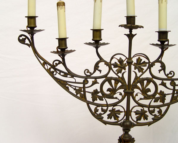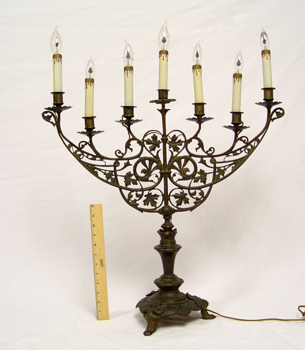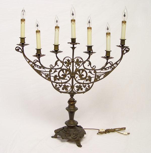 ELECTRIFIED CAST METAL MENORAH: Cast metal worn bronzed finish, electrified. 27'' high excluding bulbs x 24 3/4'' x 9'' base dia.