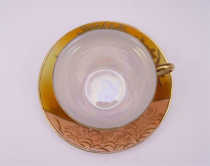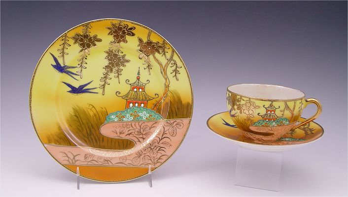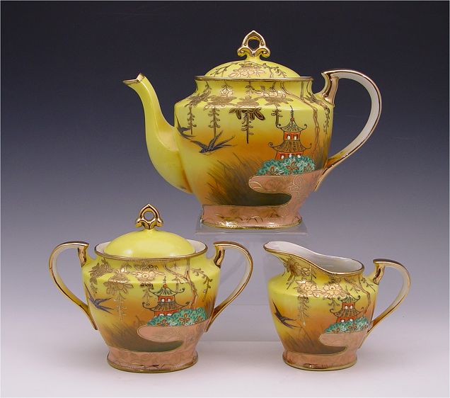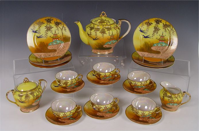 SERVICE FOR 6 HANDPAINTED JAPANESE PORCELAIN DESSERT SET: Delicate Emperor yellow porcelain with flying bluebird and gold gilt decor. 6 cups and 6 dessert plates, lidded teapot, lidded cream & sugar, handpainted with iridescent interior.