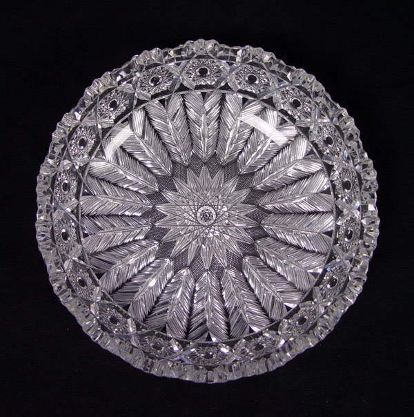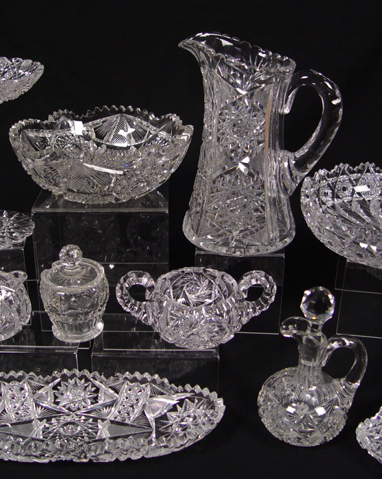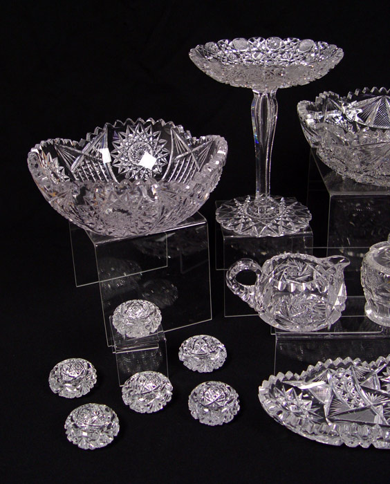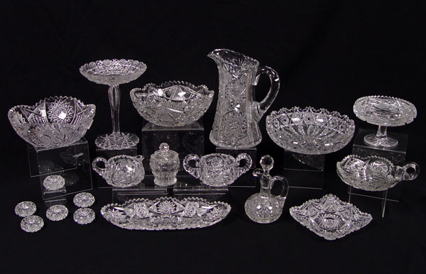 19 PIECE ESTATE COLLECTION OF AMERICAN BRILLIANT CUT GLASS: To include shallow bowl with a feather cut design, 2 1.2: tall, 9'' dia. Water pitcher (9''), tall compotes, creamer and sugar, set of 6 salts, 2 berry bowls, nappy, and cruet with stopper.