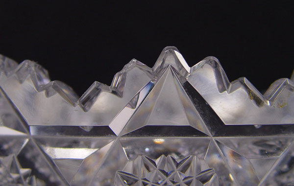 CONDITION: Very good condition with only 2 chips noted, one on base of compote and one of the teeth on a bowl. There is cloudiness on the cruet.