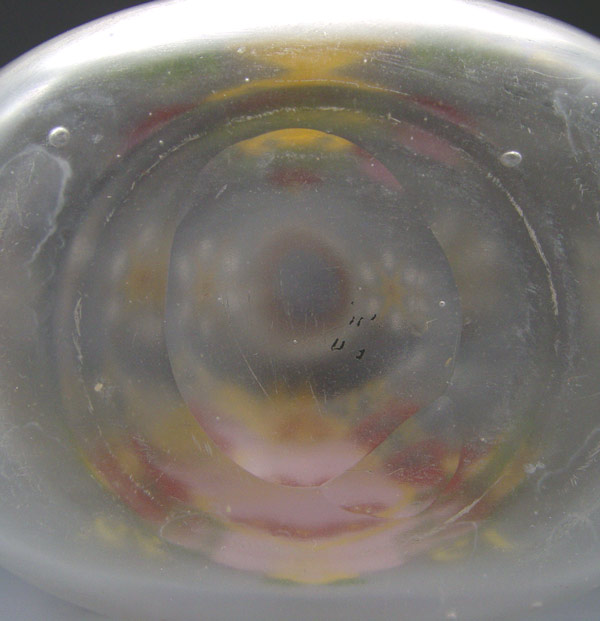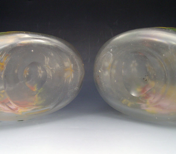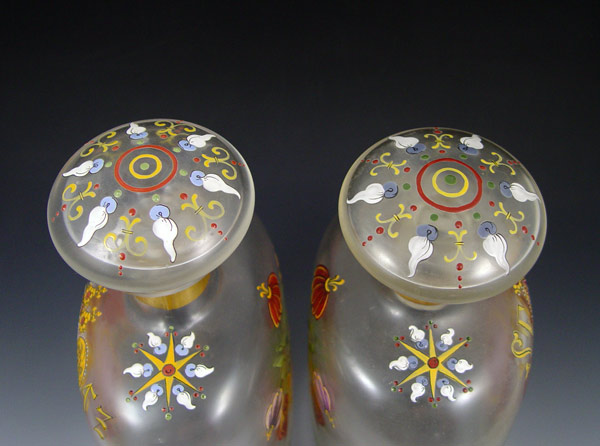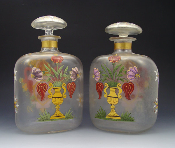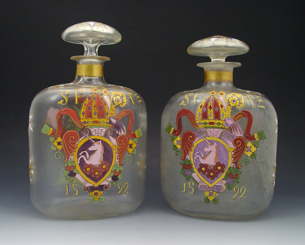 PAIR OF HERALDIC HAND ENAMELED BLOWN GLASS DECANTERS: Approx. 11'' tall, with stoppers.