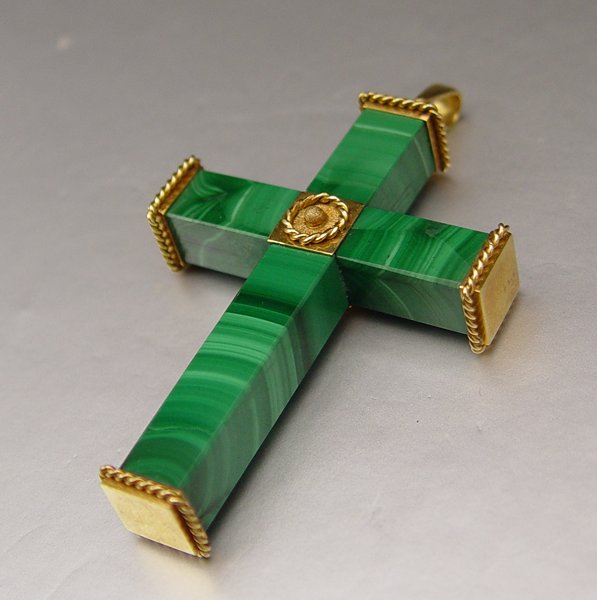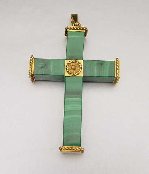 18K MALACHITE CROSS PENDANT: 18K yellow gold malachite cross pendant. Approx. 2.25'' x 1.5'' Rope detail Gold Weight: Approx. 10.0 grams