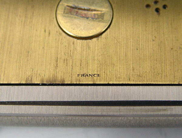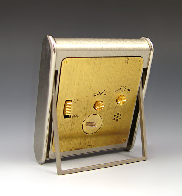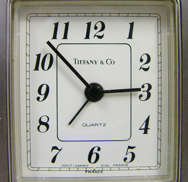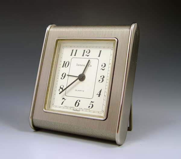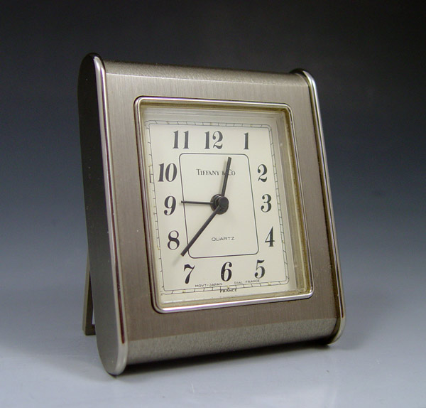 TIFFANY & CO. TRAVEL CLOCK: Japanese movement with French dial. Brushed steel case. Clock measures 3 1/4''h x 2 3/4''x 3/4''. Sold with original box 4'' x 4'' x 2 1/4''