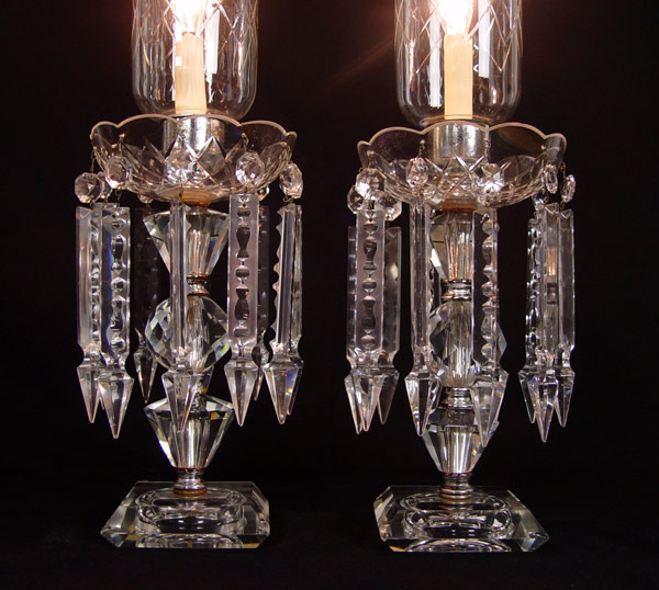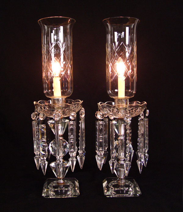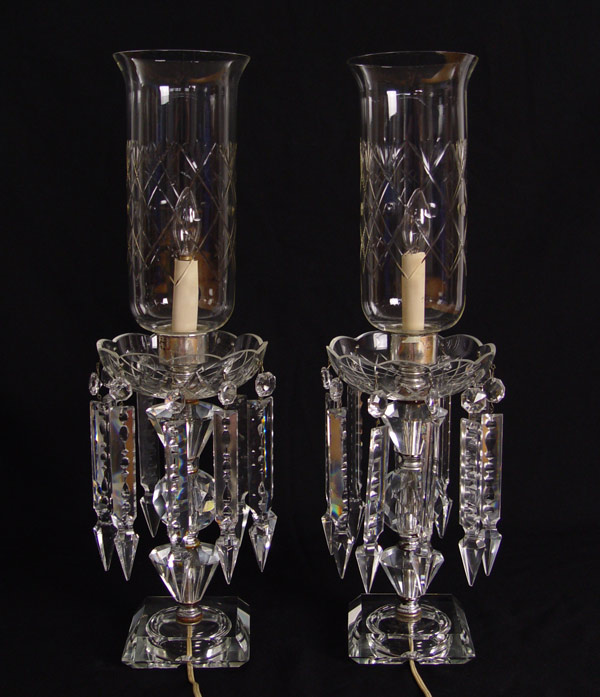 PAIR CRYSTAL HURRICANE TYPE LAMPS: Etched glass hurricane shades, long prisms 21'' tall, prisms are 6''. Please note wear to the metal fittings.