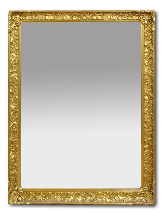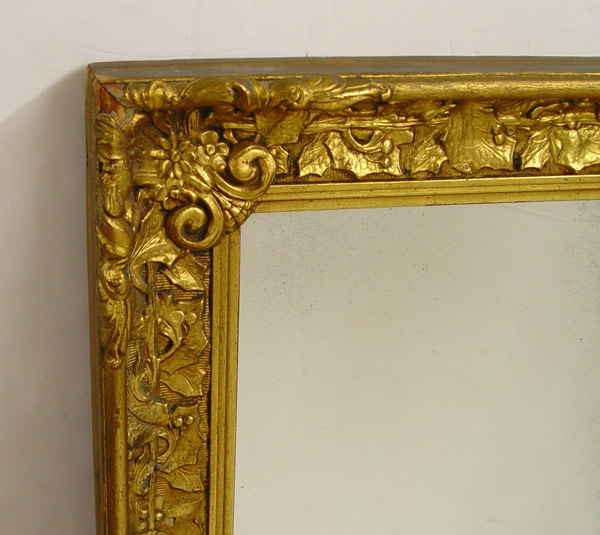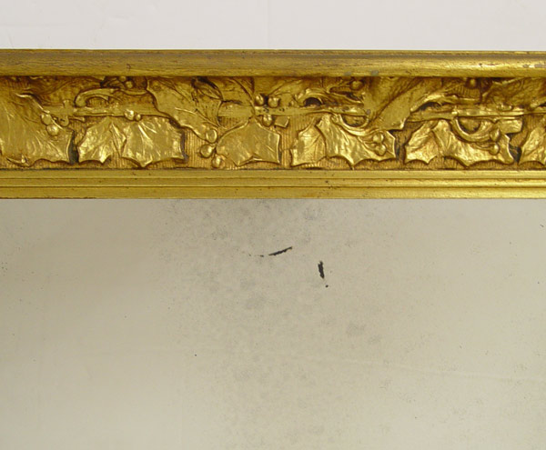 LARGE CARVED /GILDED GESSO MIRROR: Large quilt mirror with Holly leaf and berry design. 35 1/2'' wide, 2 1/2'' deep, 46'' tall