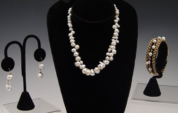 3 PIECE CULTURED PEARL JEWELRY: 1) 14K circle link and F/W cultured pear bracelet. Length: 7'' Weight:23.2 grams. 2) 14K wires with baroque drop cultured pearls. 3) Graduated strand of baroque cultured pearls. 15'' in length. 14K filigree clasp.