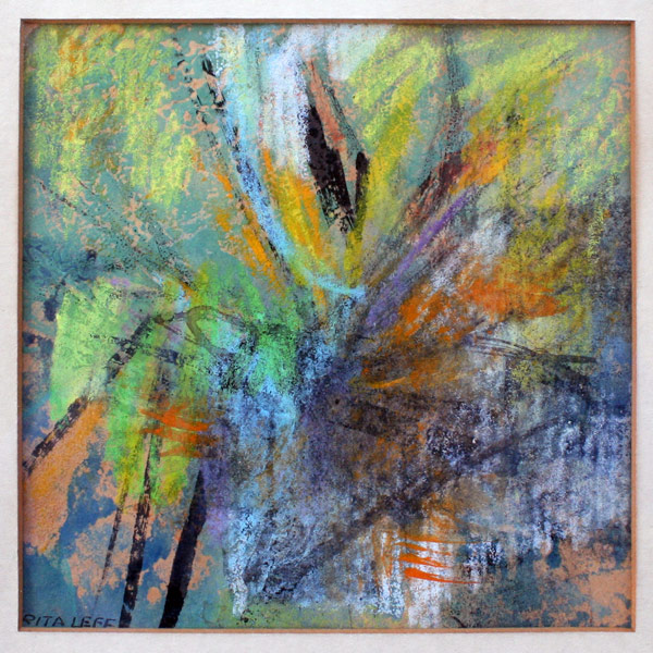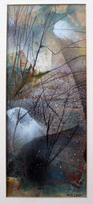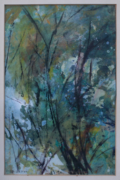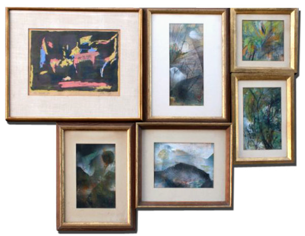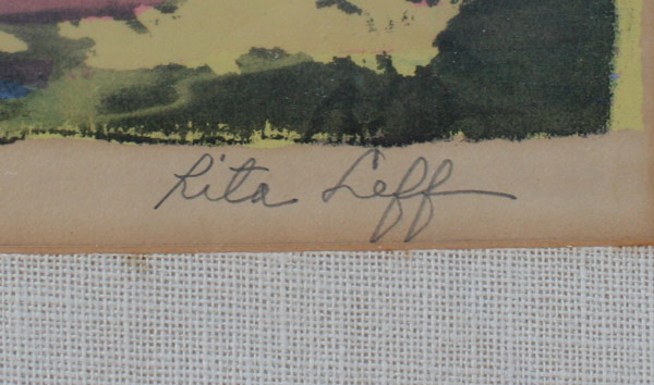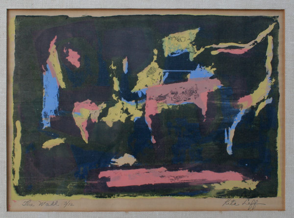 LEFF, Rita, (American, 1907-): Collection of 6 Artworks to include; 5 abstract watercolors, the largest being 12'' x 5'' sight size, framed, 18'' x 13'', all signed, and a Lithograph; ''The Wall'', sight size 9 1/2'' x 13 1/4'', pencil signed, titled and numbered 3/12, framed, 16 1/2'' x 20''.