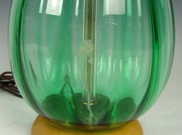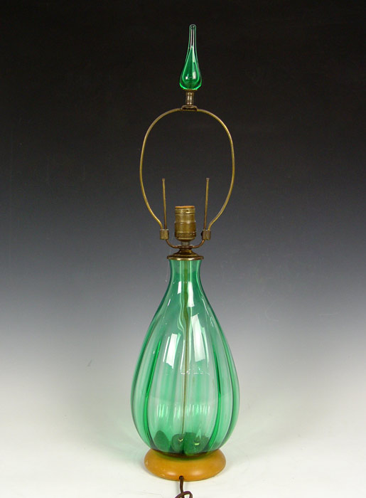 BLENKO BLOWN GLASS LAMP: Clear green glass base on wooden stand, glass measures 13''h. x 7''dia., original adjustable harp and blown glass finial, for shipping 24 1/2''h. overall.