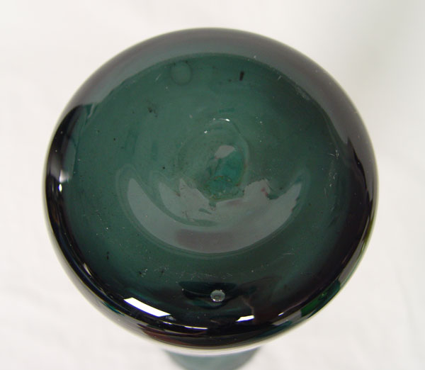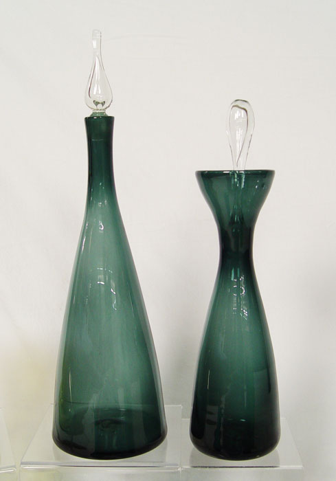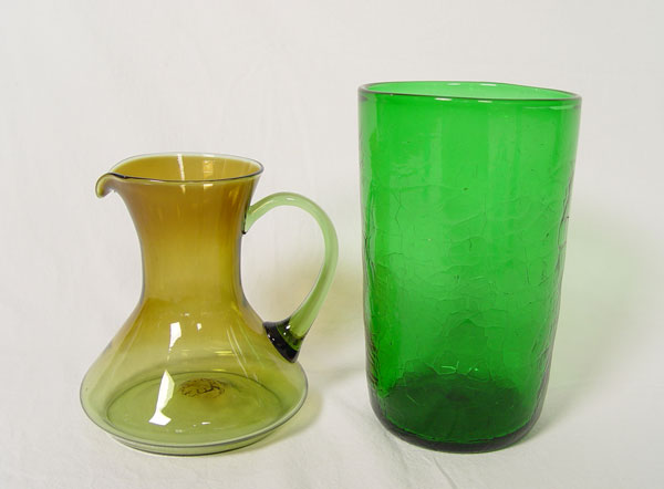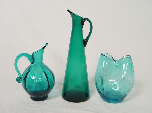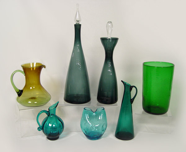 7 PIECE BLENKO BLOWN GLASS: Seven pieces to include two smoky blue glass decanters with free form stoppers, tallest being 21 1/2''h.; an amber glass pitcher 8 1/2''h. 7''dia to base; two teal glass ewers, 8'' & 12 1/4''; a pinched top vase in blue crackle glass 6 3/4''h; and a wide mouth vase in green crackle glass, 10 3/4''h. 6 3/4''dia. Sold as a lot.