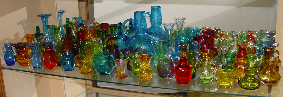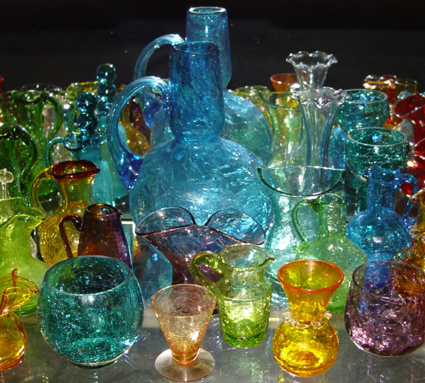 LARGE 60 PIECE ESTATE COLLECTION OF CRACKLE GLASS: Approx. 60 pieces in every color and shape imaginable. From the brightest orange, deepest red, purple, turquoise, and green. Vases, bottles with stoppers, cups, pitchers, from 2 1/2'' - 9 1/2''.