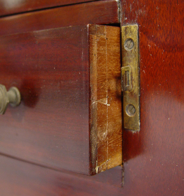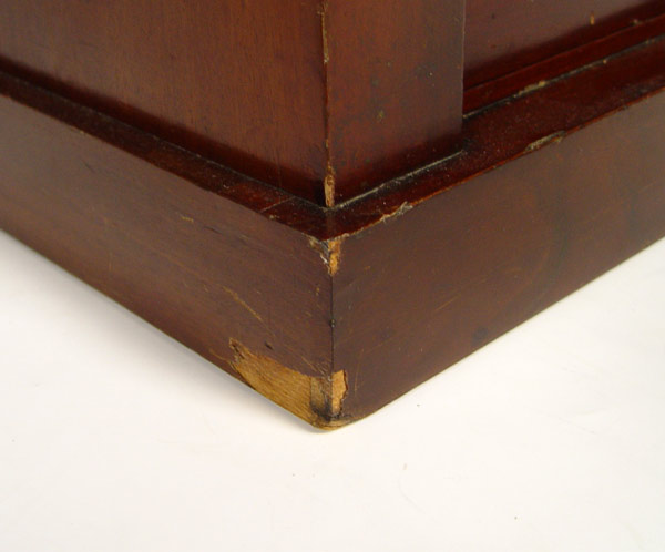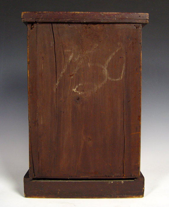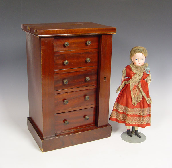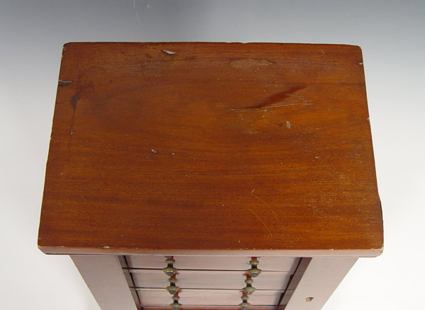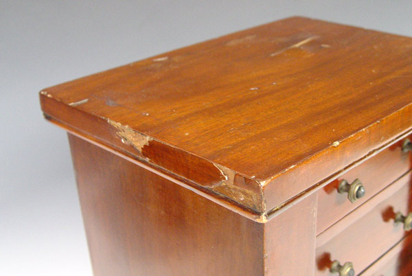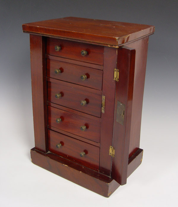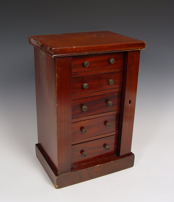 MINIATURE SIDE LOCK CHEST: Late 19th C English 4 drawer chest in miniature form. The sides columns are hinged to allow access to the drawers. 19 1/2''h. x 13'' x 9 1/2'' Est. $900/1200**