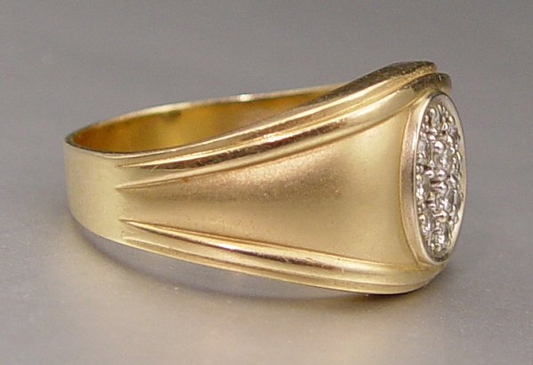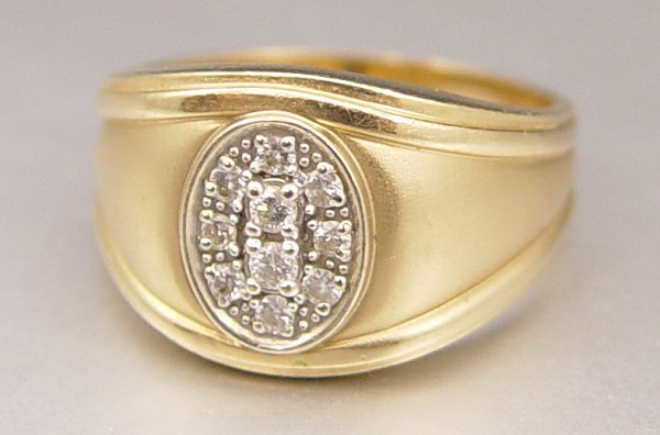 MENS 14K GOLD RING WITH 10 DIAMONDS: 14K yellow gold ring contains ten round brilliant cut diamonds. Weight: .25 Ct. Approx. The diamonds average VS in clarity and H-I in color. The diamonds are prong set. Weight: 7.8 grams. Size: 11.5