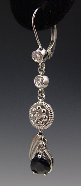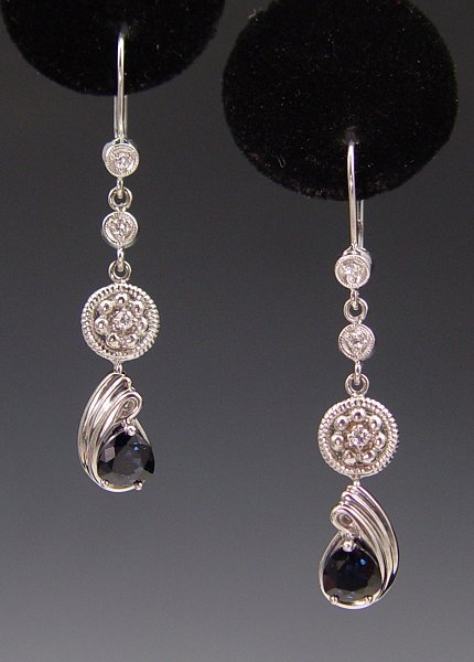 SAPPHIRE EARRINGS WITH A SPRINKLE OF DIAMONDS: 14K white gold earrings contain two pear shaped mixed cut sapphires. Weight: 1.80 Ct. Approx. Rated VS in clarity (Type II), B in Hue 7-8 in Tone and 2-3 in Saturation. Six round brilliant cut diamonds. Weight: .16 Ct. Approx. Rated VS-SI in clarity and H-I in color. The sapphires and diamonds are prong set. 1 3/4'' length includes the wire and lever back closures. Weight: 5.2 grams.