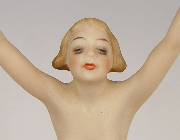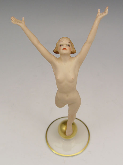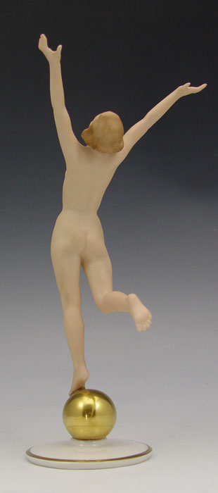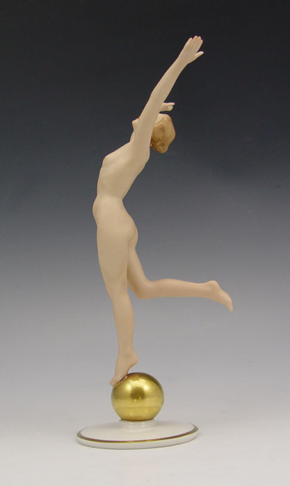 GERMAN HUTSCHENREUTHER PORCELAIN NUDE: Karl Tutter designed nude on a gold ball, 8 1/4'' tall.