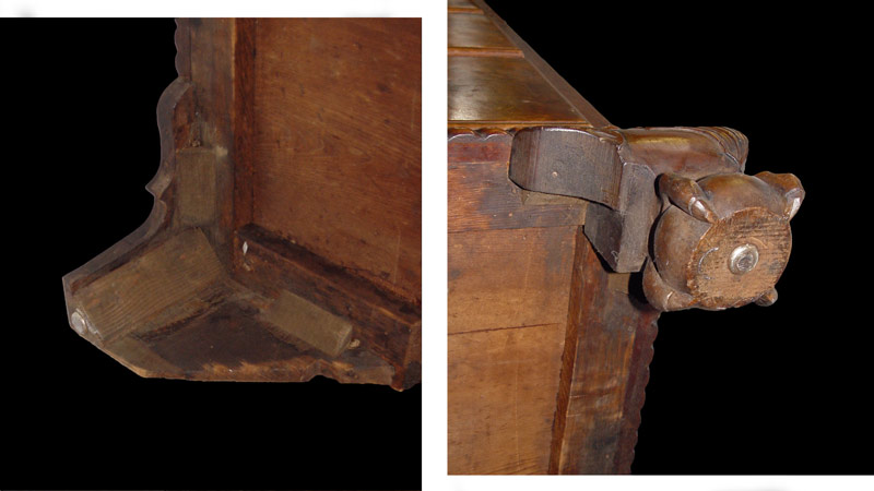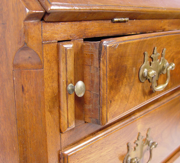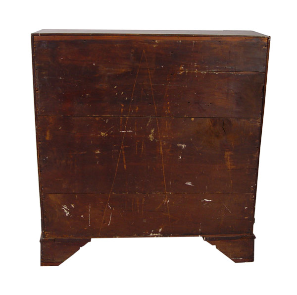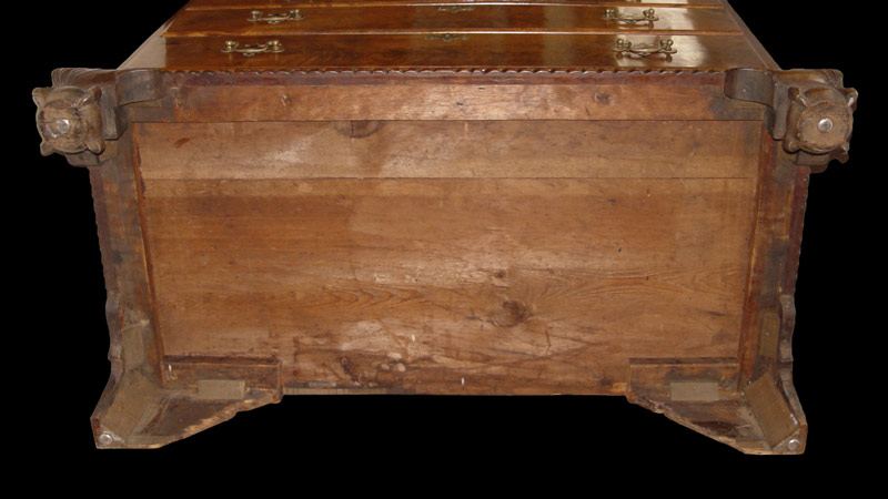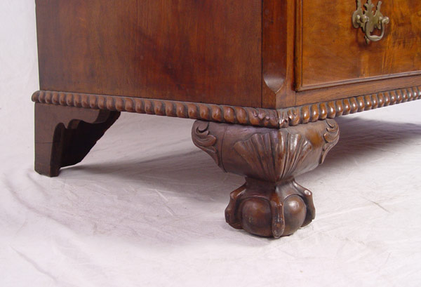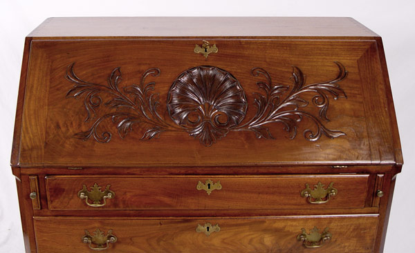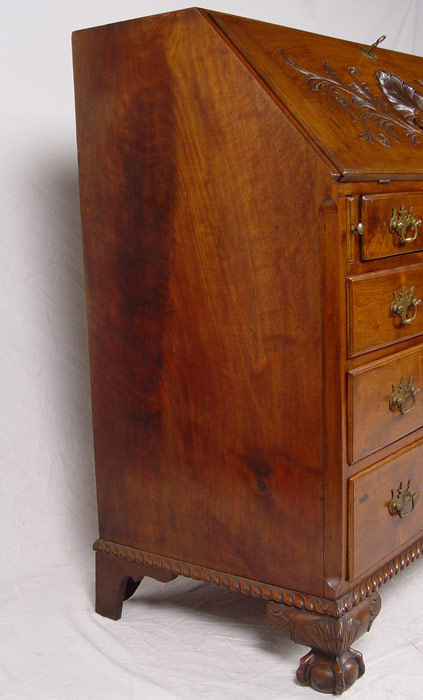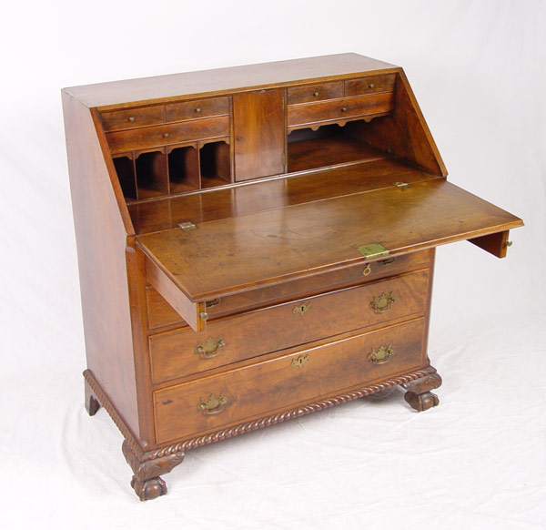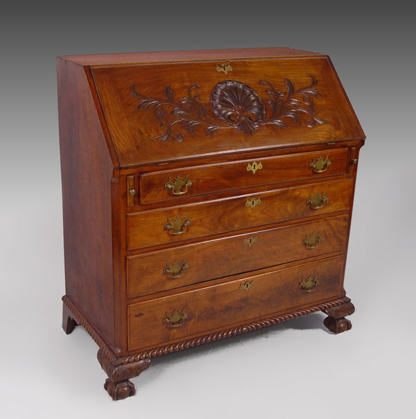 CA. 1770'S PERIOD AMERICAN CHIPPENDALE SLANT FRONT DESK: Relief carved fall front over 4 full length drawers. Interior with drawers and pigeon holes. Ball and claw front feet uner a gadroon trimmed base. One board sides. 43 1/2'' x 40'' x 21''