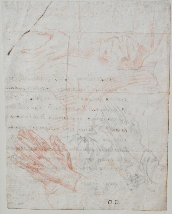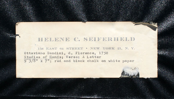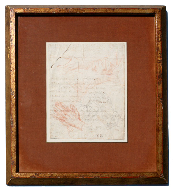 DANDINI, Ottaviano, (Italian, 1706-1740): Study of Hands, Red & Black Chalk on Paper, 9 3/8'' x 7'', monogrammed O.D., framed, 19'' x 15 1/2''. Sketch was done verso of a letter by unknown author, hinge mounted, Helene C. Seiferheld label verso. Est. $2000/4000**
