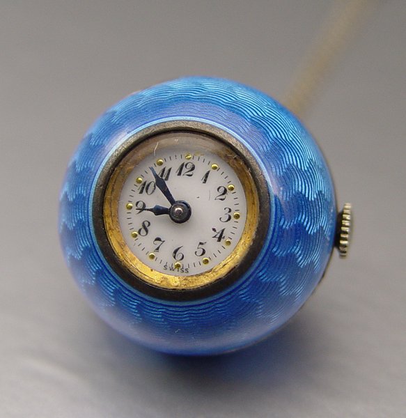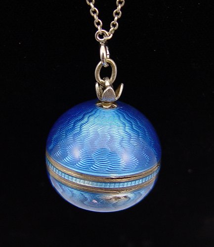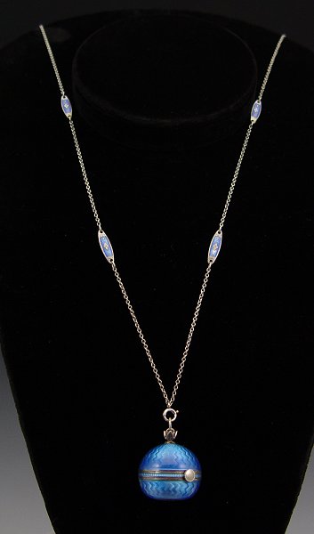 GUILLOCHE ENAMEL BALL WATCH: Pendant watch with matching sterling chain. The chain is interspersed with enamel plaques. Porcelain dial, Swiss movement. Running order. Please note very small smudge of enamel loss. 24'' long chain.