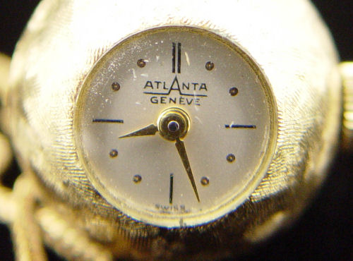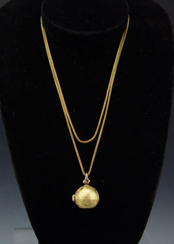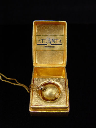 ATLANTA BALL WATCH ON CHAIN CA 1950: Gold plate ball watch and chain with original box. An approx. 18.5mm textured gold ball watch with Swiss 17 jewel movement, currently keeping time, original crown, appropriate signs of wear for age, circa 1950. Box 2'' x 1 1/2'' x 1 3 /16''.