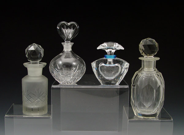 GREAT COLLECTION OF 7 GLASS PERFUME BOTTLES: Includes Art Deco nude stopper, cobalt cut to clear satin, cut glass, malachite glass.