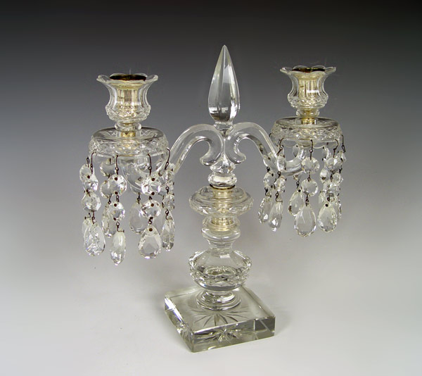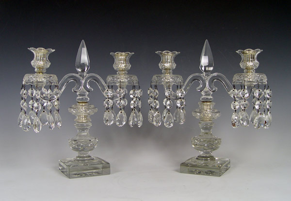 PAIR ELEGANT GLASS CANDLE HOLDERS: Fine glass two light candelabra, 12'' tall, 11'' wide.