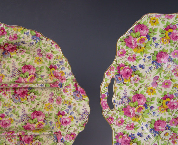 7 PIECE ROYAL WINTON SUMMERTIME CHINTZ: To include a divided dish (10 x 12''), pierce handle cake plate, mustard, mayonnaise bowl and underplate, a small serving bowl (6 3/4''), and a pierce handle dish (6 3/4'')
