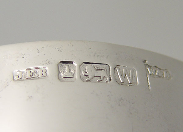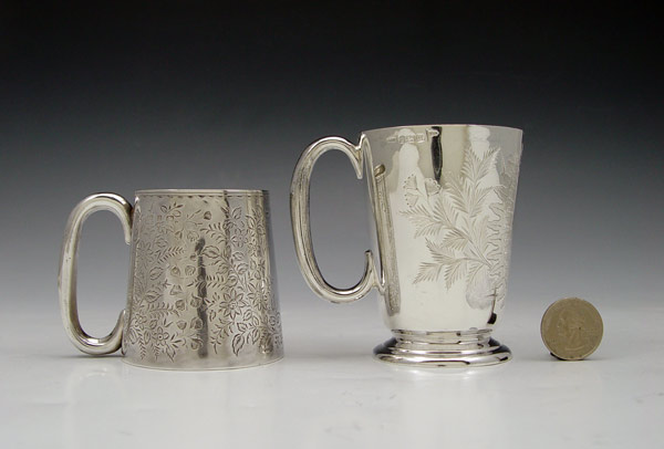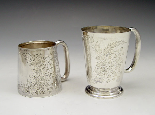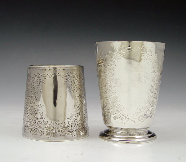 2 PIECE ENGLISH STERLING CHRISTENING & CHILDS CUPS: To include 1) Cornelius Desormeaux Sanders & James Francis Hollings / Frank Shepherd, Birmingham 1898 childs cup, engraved floral design. 2 5/8'' h x 3 1/2'' overall. 2) Walker & Hall, Sheffield 1889 christening cup, engraved floral design. Also bears the hallmark for John Edward Bingham. 3 1/2'' h. x 3 1/2'' overall. Approx. 6.5 troy oz.