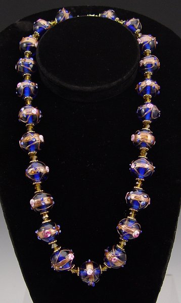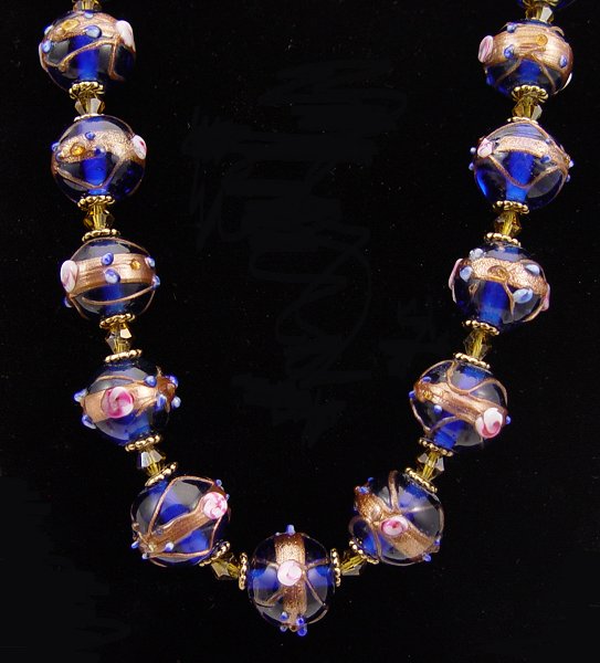 VENETIAN GLASS BEAD NECKLACE: Strand of 23 enamel and gold decorated cobalt colored glass beads. Alternating with Swarovski crystal beads, 20'' long including the screw clasp. Venetian beads are 16.5 mm.