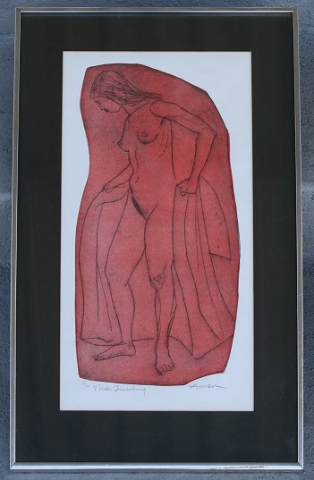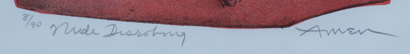 AMEN, Irving (American, 1918-2007): ''Nude Disrobing'', Lithograph, sight size 22'' x 12'', pencil signed lower right, titled lower left, 8/90, framed, 28'' x 18''.