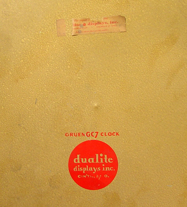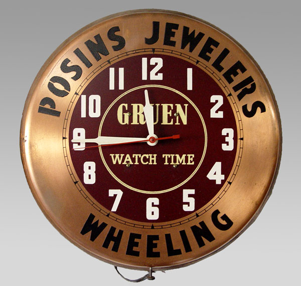 POSIN JEWELERS WHEELING ADVERTISING WALL CLOCK: Electric wall clock with copper appearance face. face marked POSINS JEWELERS WHEELING (West Virginia), GRUEN CLOCK TIME. Made by Dualite Displays Inc., Gruen GC7 Clock. Measures 16'' dia. x 2 3/4'' deep.