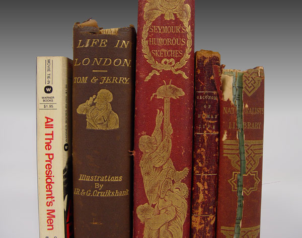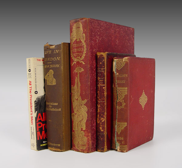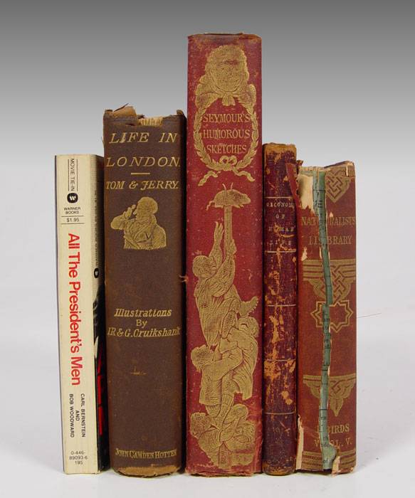 5 PIECE COLLECTION OF BOOKS: 1)TOM & JERRY: LIFE IN LONDON; OR, THE DAY AND NIGHT SCENES OF JERRY HAWTHORN, ESQ. AND HIS ELEGANT FRIEND CORINTHIAN TOM IN THEIR RAMBLES AND SPREES THROUGH THE METROPOLIS by Pierce Egan. With Numerous Coloured Illustrations from Real Life Designed by I.R. & George Cruikshank. London: John Camden Hotten, n.d. [ca. 1884]. Octavo, gilt-stamped cloth, uncut, xvi, 406 pp, 32 -page publishers catalog. 36 color plates. Good: fraying to head and foot spine, front hinge tender. 2) THE NATURAL HISTORY OF THE NECTARINIADAE, OR SUNBIRDS, by Sir William Jardine. London: Henry G. Bohn, 1864. Naturalist's Library, Volume V. Duodecimo, red cloth, 277 pp. Frontis portrait. 30 handcolored plates, illus. Poor; spine is split, binding is loose. 3) THE OECONOMY OF HUMAN LIFE, TRANSLATED FROM AN ANCIENT BRAMIN. TO WHICH IS PREFIXED AND ACCOUNT OF THE MANNER IN WHICH THE SAID MANUSCRIPT WAS DISCOVERED. IN A LETTER FROM AN ENGLISH GENTLEMAN NOW RESIDING IN CHINA TO THE EARL OF E****, by Robert Dodsl