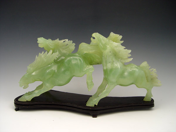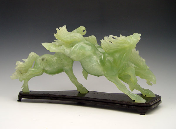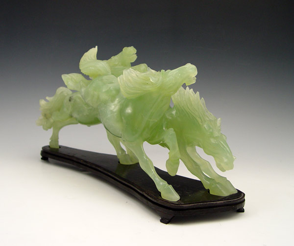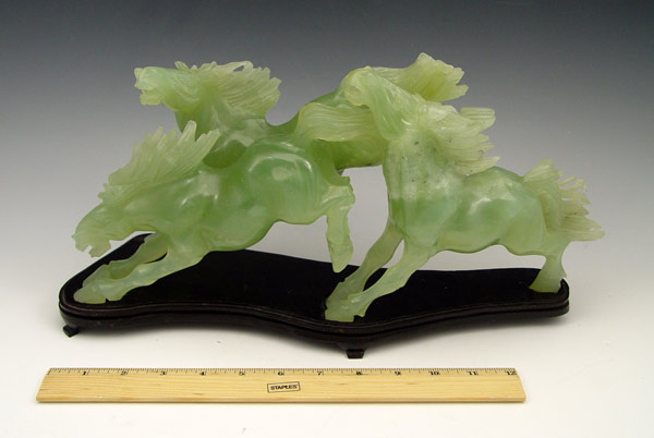 CHINESE CARVED GREEN QUARTZ HORSE GROUP: Jade like stone carving of three horses, 14'' length x 7'' tall. Sold with the wood stand.
