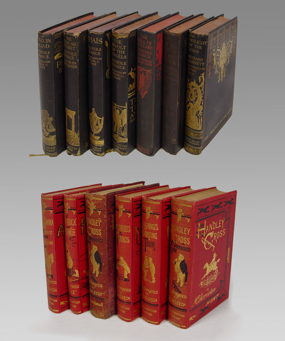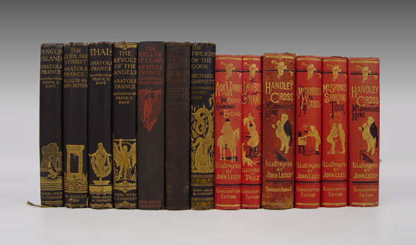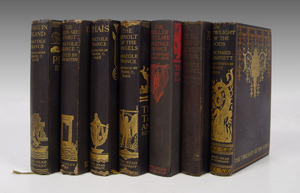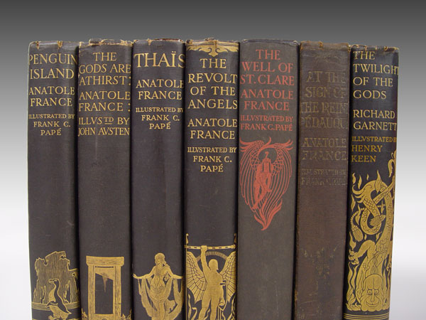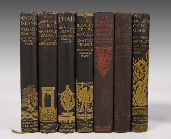 13 PIECE ANTIQUE BOOKS: 7 Handsome Illustrated Volumes Published by Dodd, Mead & Company. One lot of seven volumes, including: (1) France, Anatole. AT THE SIGN OF THE REINE PÉDAUQUE. With Illustrations & Decorations by Frank C. Papé. NY, 1923. Good. (2) France, Anatole. THE GODS ARE ATHIRST. With Illustrations and Decorations by John Austen. NY, [1927]. Good. (3) France, Anatole. PENGUIN ISLAND. With Illustrations and decorations by Frank C. Papé. NY, [1925]. Very Good. (4) France, Anatole. THE REVOLT OF THE ANGLES. With Illustrations & Decorations by Frank C. Papé. NY [1924]. Very Good. (5) France, Anatole. THA?S. With Illustrations & Decorations by Frank C. Papé. NY, [1926]. Very Good. (6) France, Anatole. THE WELL OF SAINT CLARE. Illustrations & Decorations by Frank C. Papé. NY, [1928]. Fine in a slightly chipped dust jacket. (7) Garnett, Richard. THE TWILGHT OF THE GODS AND OTHER TALES. Illustrated by Henry Keen. NY, [1926]. Very Good. Each of the volumes is bound in gilt-stamped black cloth, with black