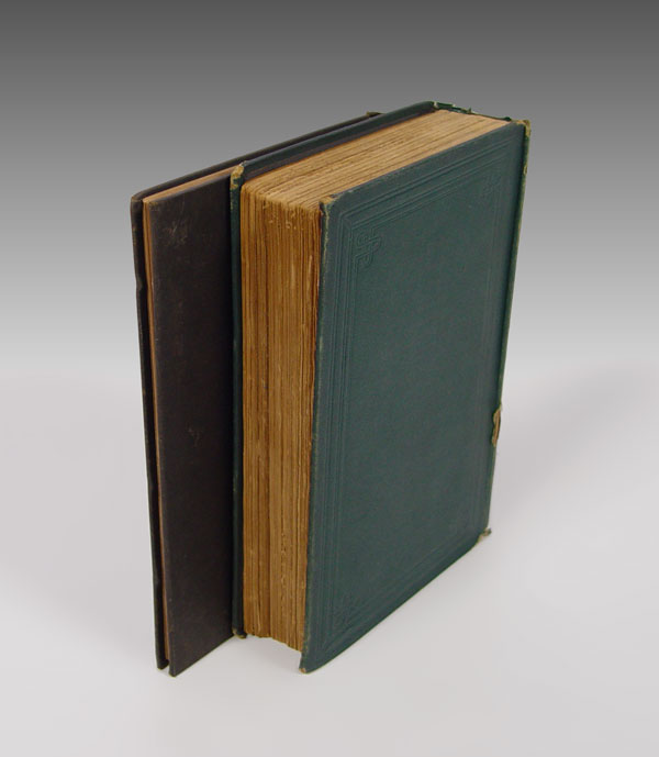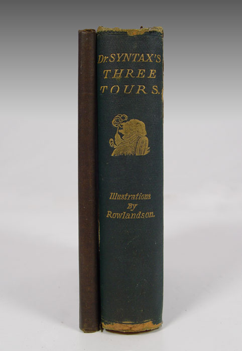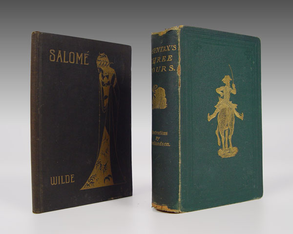 2 PIECE ANTIQUE BOOKS: 1) DOCTOR SYNTAX'S THREE TOURS IN SEARCH OF PICTURESQUE, OF CONSOLATION, AND A WIFE. by William Combe. Complete and Unabridged, with a Life of the Author by John Camden Hotten, and Eighty Full-Page Illustrations Drawn and Coloured after the Originals by T. Rowlandson. London: Chatto and Windus, n.d. {ca. 1895.] Octavo, gilt-decorated green cloth, x1viii, 345, 32 pp. Color plates. Good; shelf worn. 2) SALOMÉ, A TRAGEDY IN ONE ACT, by Oscar Wilde. Drawings by Aubrey Beardsley. Boston: John W. Luce & Company, 1907. Octavo, gilt-decorated black cloth, 36 pp. Plates, illus., decorations. Very Good.