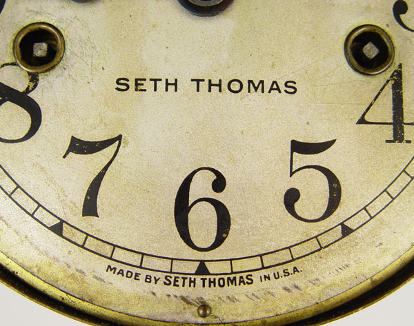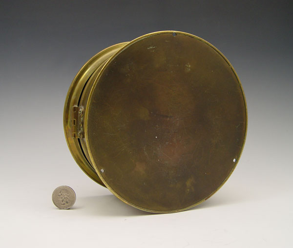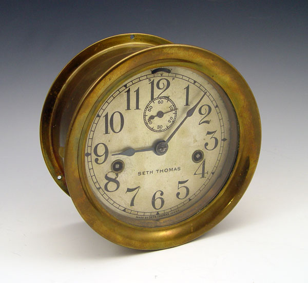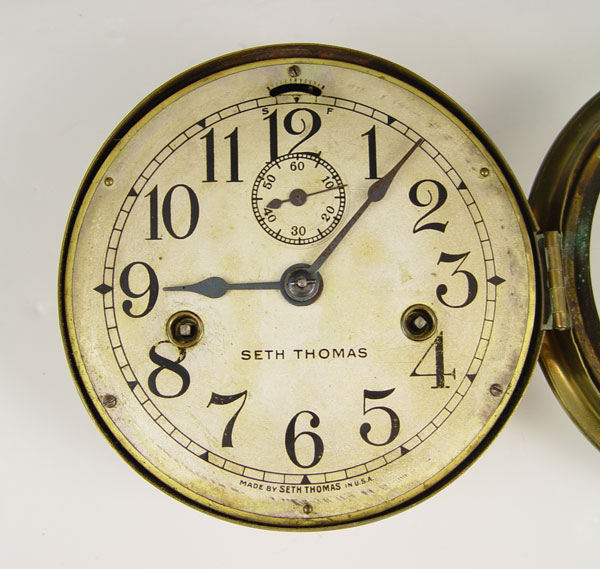 SETH THOMAS BRASS CASE SHIPS CLOCK: Marked Seth Thomas on metal face. Brass case. Key wind movement, no key. 3 1/2'' h x 7'' dia.
