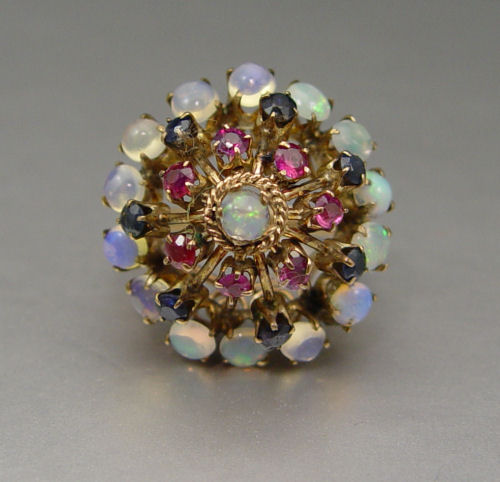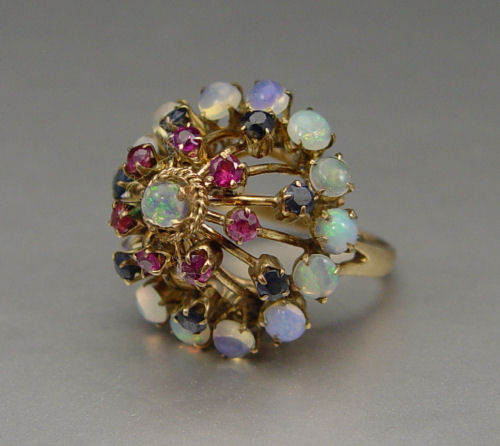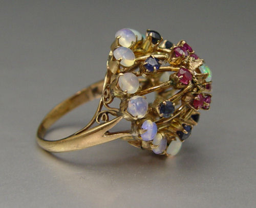 14K HAREM RING WITH OPALS, RUBIES, AND SAPPHIRES: 14K yellow gold ring contains fifteen round cabochon cut crystal opals. Weight: 1.00 Ct. Approx. Blue/Green play-of-color. Seven round mixed cut rubies. Weight: .70 Ct. Approx. Seven round mixed cut sapphires. Weight: .70 Ct. Approx. All stones are prong set. Weight: 5.6 grams. Size: 5.5