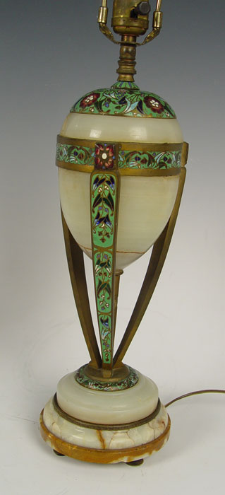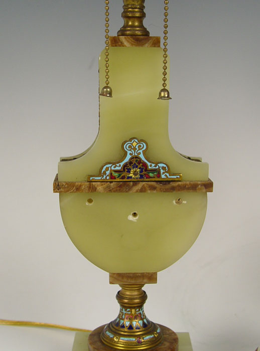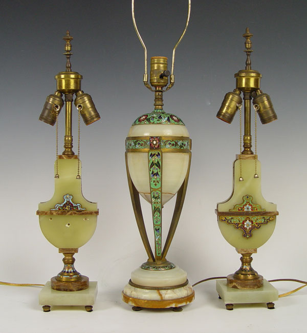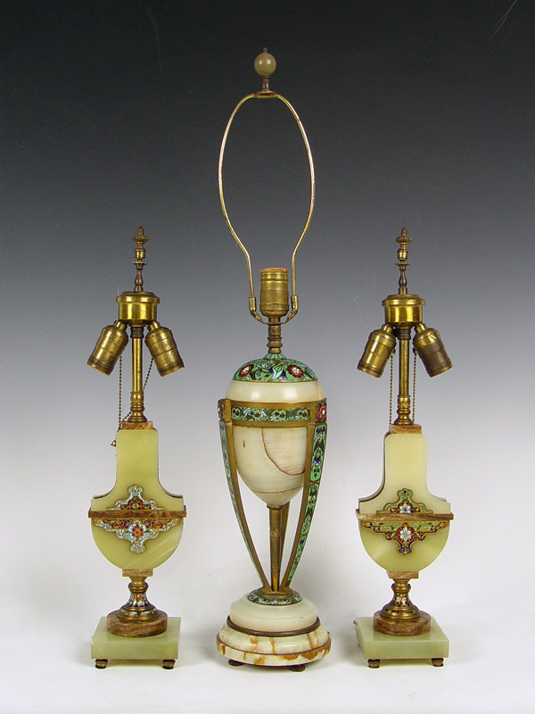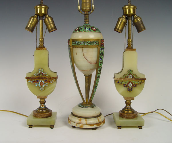 3 ONYX CHAMPLEVE LAMPS: Pair of urn shaped double socket lamps, approx. 4''w., 21''h. Single lamp 5'' dia., 29''h. overall, harp removes for shipping height of approx. 20''.
