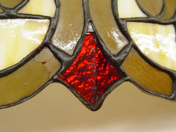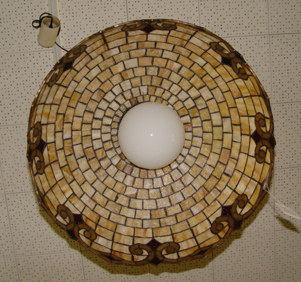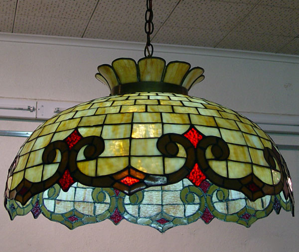 STAINED GLASS HANGING LIGHT: Shade measures approx. 12 1/2''deep and 24 1/2''dia., overall approx. 30''h. with chain