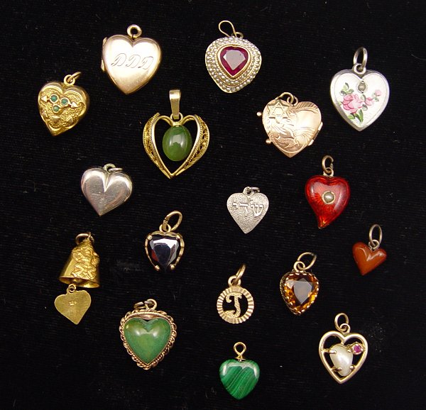 COLLECTION OF HEART CHARMS / PENDANTS: Approx 17 charms to include 14K, 18K, sterling silver, G.F. and unknown metals. Genuine, simulated and unknown gemstones. Gold Weight: 8.0 grams.