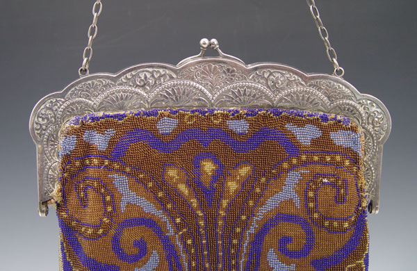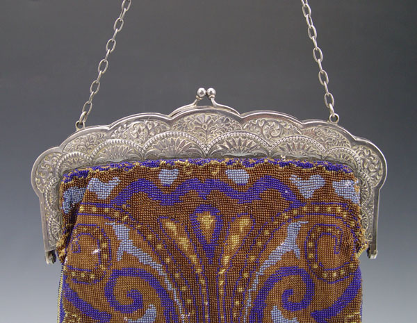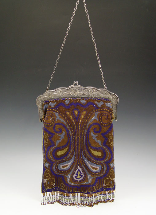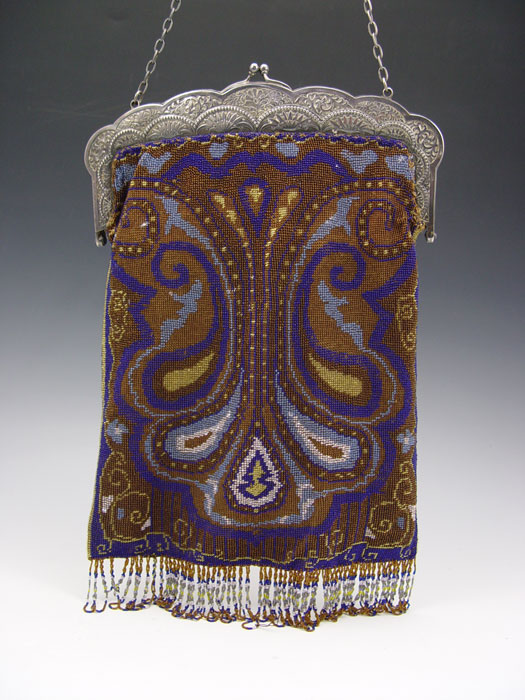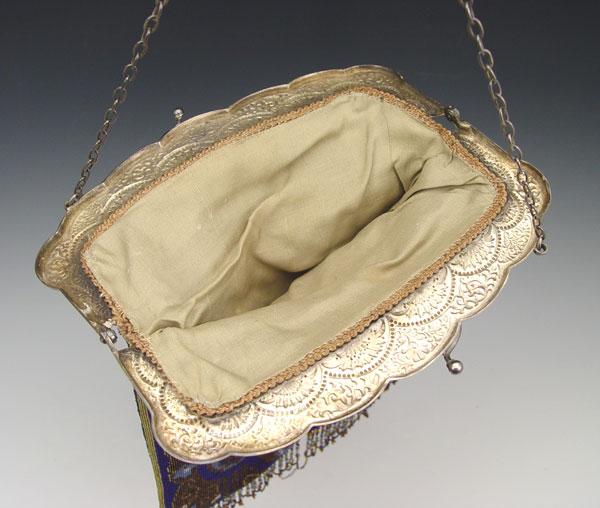 LARGE ANTIQUE BEADED BAG WITH BEAD FRINGE: Blue ochre & gold, silver metal clasp & handle, 8''w., 13''l. includes the fringe, excludes the handle.