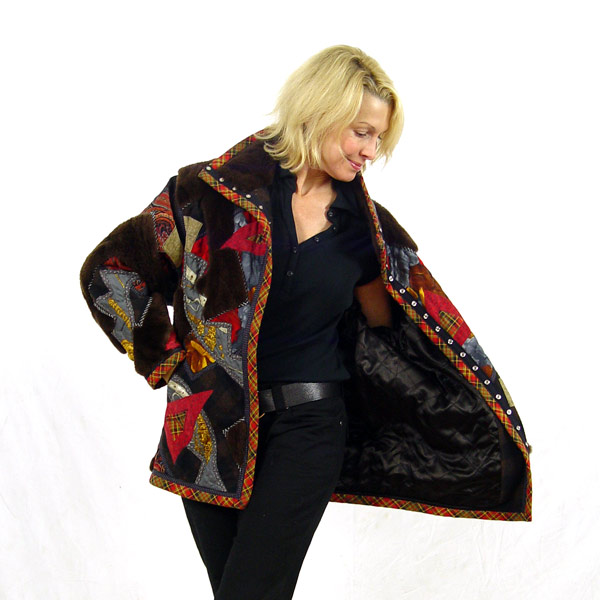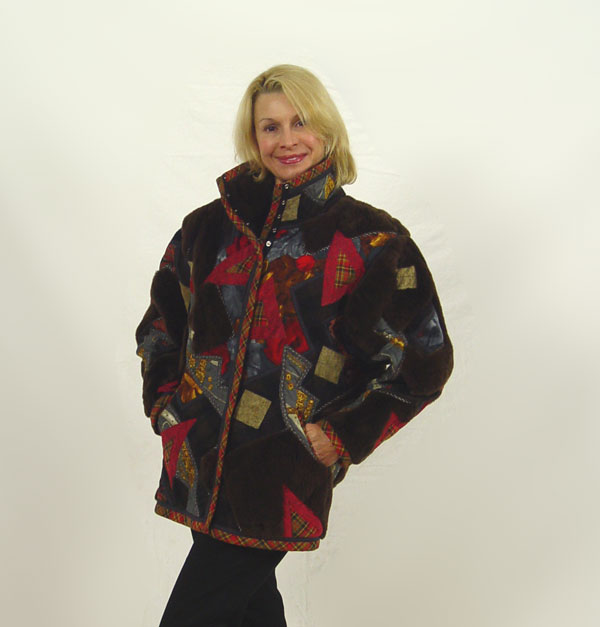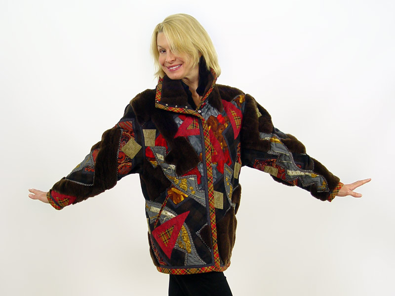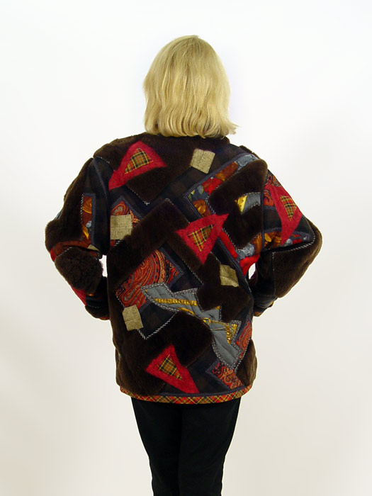 KOOS VAN DEN AKKER KOOS COUTURE COLLAGE JACKET: Sheepskin and fabric collage exterior with quilted interior. By the designer of among others, the Bill Cosby sweaters. Labeled ''Koos Couture / Koos Van Der Akker New York''. Larger size, Approx. 30''l, 19'' across the shoulders.