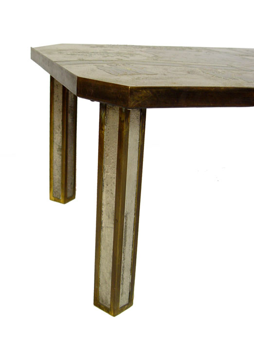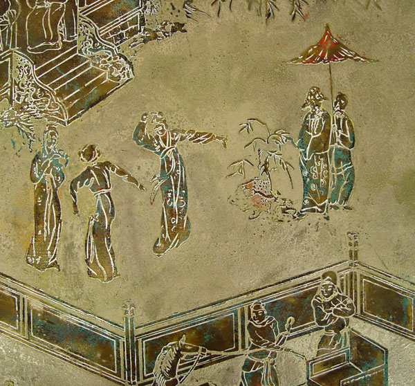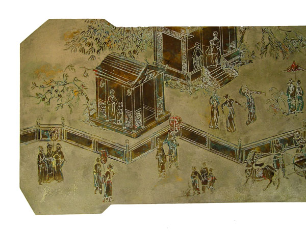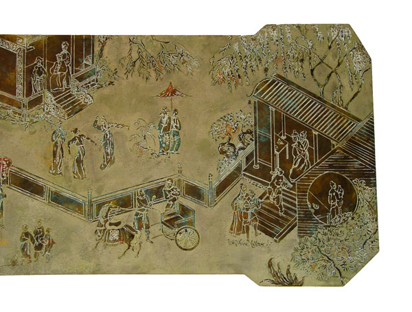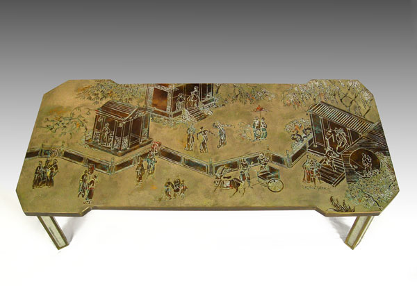 PHILIP & KELVIN LAVERNE SU-TAO COFFEE TABLE: Custom design oriental motif titled ''Su-Tao'' with original Gallery tag / address label. Enameled and patinated bronze top features figures, buildings and animals. Measures 17'' h. x 60'' x 28''.