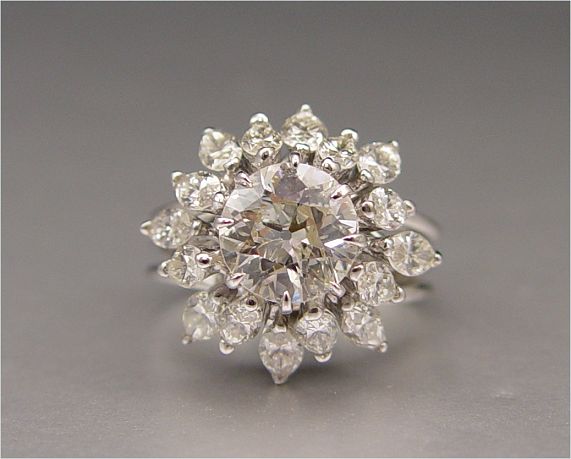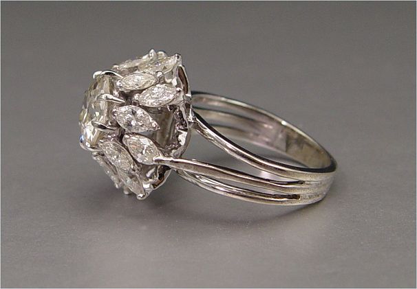 SHOW STOPPING 3.11 CT DIAMOND RING: 14K white gold ring centering a 1.75 Ct Old European Round cut diamond, rated SI3 in clarity and L color. This diamond is framed by 16 marquise brilliant cut diamonds. approx. 1/36 Ct., averaging VS1 in clarity and K-L-M color. Prong set. Size 6. Weight 6.2 grams. Sold with current Florida Diamond Appraisers GIA graduates appraisal for $8,650.